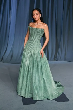 ظهرت بفستان أخضر باهت مزين بطيات دقيقة على الصدر، مؤكدة مكانتها كسفيرة للعلامة.