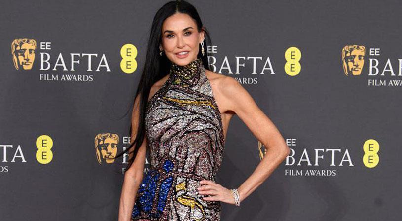 تألقت مور بفستان McQueen في BAFTA، حيث صممت الزخارف الكريستالية لتجسيد وجوه وأجزاء جسد مستوحاة من فيلم “The Substance”.