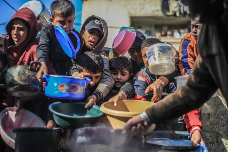 يتلقى الأطفال الفلسطينيون طعاماً مُعداً في مطبخ خيري برفح