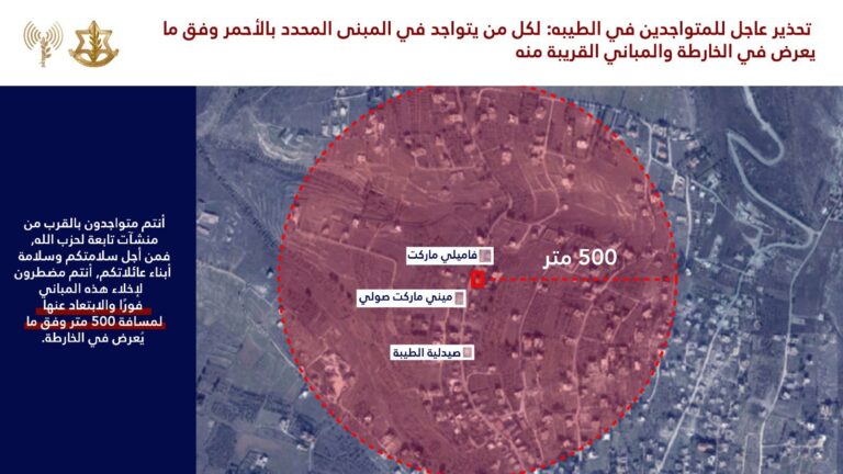 وحثّ أدرعي سكان المباني المعلّمة بالأحمر في الخرائط المرفقة، والمباني المجاورة لها في قريتي الطيبة وطير دبّا، على إخلائها فورًا والابتعاد مسافة لا تقل عن ٥٠٠ متر «حفاظًا على سلامتهم»، مؤكدًا أن البقاء ضمن نطاق تلك المباني «يعرضهم للخطر». ولم تصدر على الفور تعليقات من الجانب اللبناني أو من «حزب الله» بشأن التحذير.