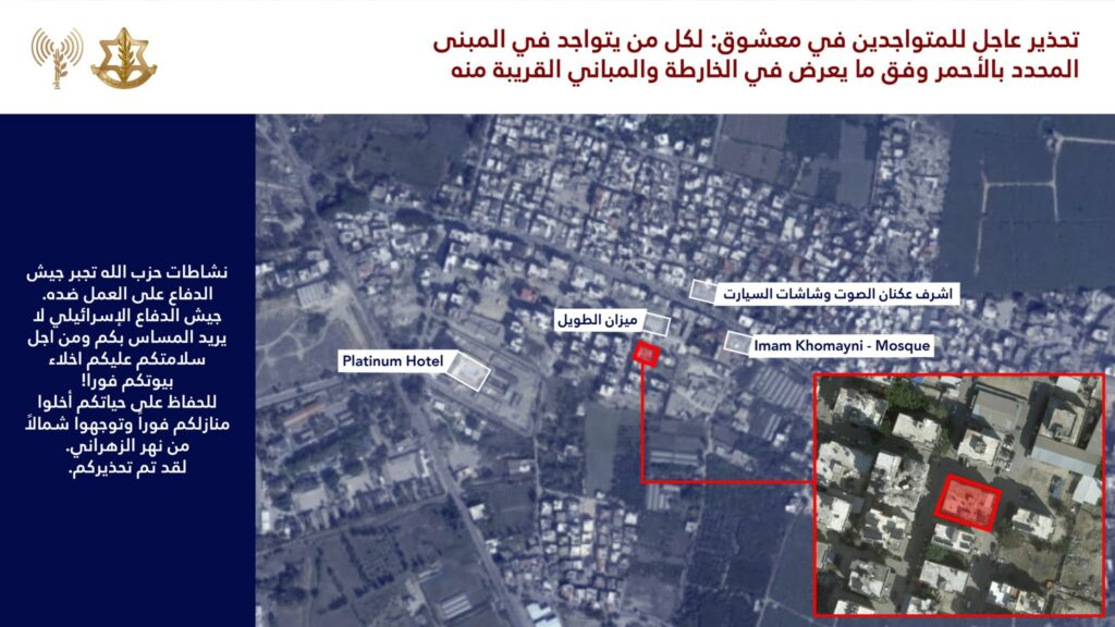وسّع المتحدث باسم الجيش الإسرائيلي، أفيخاي أدرعي، نطاق الإنذار العاجل الموجّه إلى سكان جنوب لبنان، ليشمل مناطق برج الشمالي ومعشوق وصور، داعيًا الأهالي إلى إخلاء منازلهم فورًا.وقال أدرعي إن «نشاطات حزب الله تجبر جيش الدفاع على العمل ضده وبقوة»، مضيفًا أن الجيش الإسرائيلي «لا يريد المساس» بالسكان.ودعا السكان، «حرصًا على سلامتهم»، إلى مغادرة منازلهم بشكل فوري، مطالبًا إياهم بالانتقال إلى شمال نهر الزهراني.
