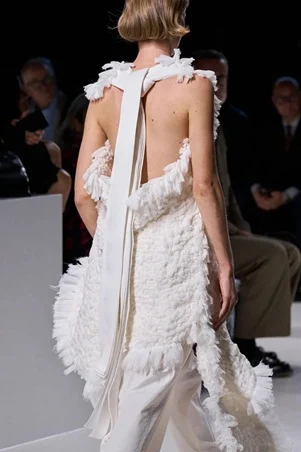 لم يعد الأبيض لوناً بسيطاً أو محايداً، بل مساحة مفتوحة للّعب على الملمس والخامة. في العرض، جاء الأبيض بطبقات غنيّة ومتنوّعة، من القطن الخفيف إلى الريش، ومن الحياكات الثقيلة إلى السراويل الانسيابية. هذا التناقض في الخامات هو ما منح الإطلالات قوتها، من دون الحاجة إلى ألوان إضافية.