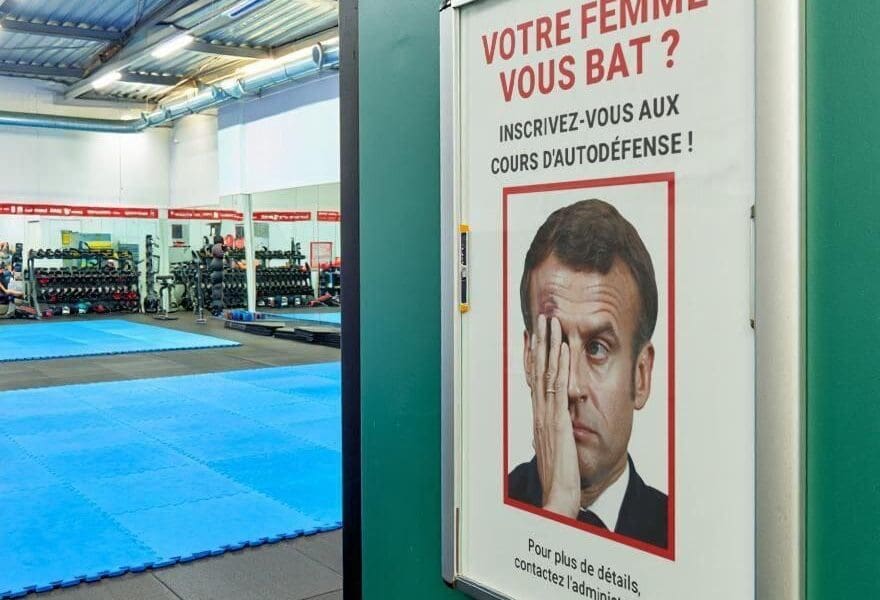 انتشر إعلان غريب ومثير للجدل عبر وسائل التواصل الاجتماعي في فرنسا، يظهر فيه الرئيس الفرنسي إيمانويل ماكرون بعين مغطاة وعلامة كدمة على جبينه، كضحية للعنف الأسري. الإعلان، الذي يبدو أنه التُقط في إحدى صالات الألعاب الرياضية الفرنسية، كتب عليه: “زوجتك تضربك؟ سجل في دورات الدفاع عن النفس! لمزيد من المعلومات، اتصل بالإدارة”.