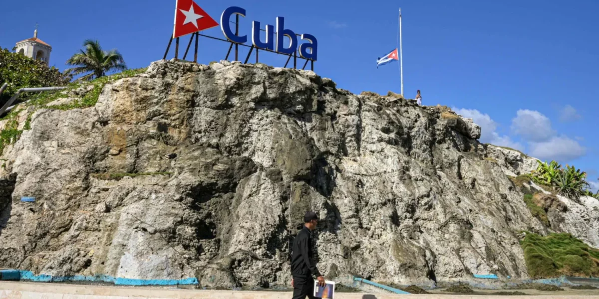 رجل كوبي يمر بجوار لافتة تحمل اسم كوبا وعَلم وطني منكس في هافانا