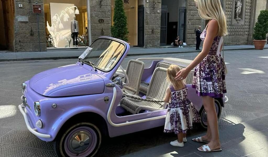 ظهرت كيتي بفستان أبيض وأرجواني قصير من البوبلين، مكشوف عند منطقة الصدر، من مجموعة دولتشي آند غابانا الجديدة، بينما ارتدت أثينا نسخة مماثلة من الفستان، مخصصة للأطفال، يُقدّر سعرها بـ845 دولارًا. الصورة التقطت خلال نزهة سياحية شملت زيارة برج بيزا المائل.