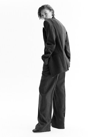 • سترة صوفية مزدوجة الأزرار بأكمام واسعة وحواف غير معالجة تضيف طابعاً خاماً ومتحرراً.