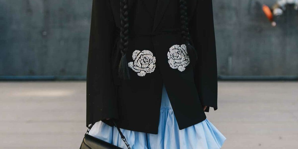 إطلالة غير معتادة تجمع بين تنورة مكشكشة، حذاء رياضي بكعب عالٍ، وسترة مزينة بالورود، تكملها ربطة العنق لتمنح لمسة من التناسق وسط هذا المزيج المتنوع.