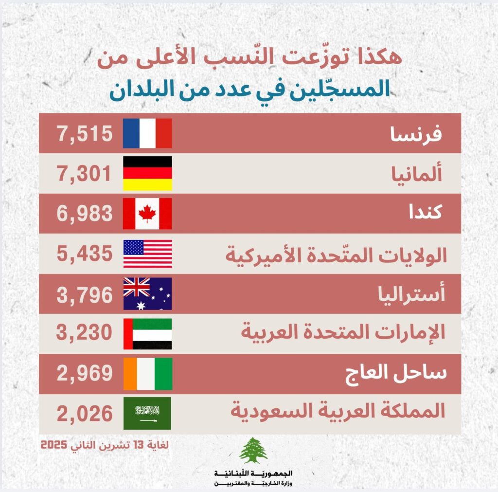 تضع وزارة الخارجية والمغتربين أمام اللبنانيين والناخبين في دول الانتشار جدولًا مفصلًا يبيّن أعداد المسجّلين بحسب البعثات الدبلوماسية والقنصليات اللبنانية حول العالم حتى يوم أمس الخميس الواقع في 13 تشرين الثاني 2025، وذلك وفق البيانات الواردة عبر المنصّة الإلكترونية الخاصة بالتسجيل في الانتخابات النيابية للمغتربين : diasporavote.mfa.gov.lb