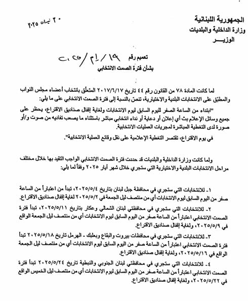 ذكرت وزارة الداخلية بالتعاميم الآتية قبيل الإنتخابات البلدية والاختيارية في محافظات بيروت، البقاع وبعلبك الهرمل.