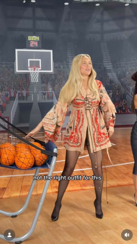 واعتمدت تسريحة شعر منسدلة ومكياجًا ناعمًا بألوان وردية، ما عزز الطابع الربيعي للإطلالة. ولاحقًا، ظهرت بنفس الزي في ملعب كرة السلة، في خطوة وصفتها بنفسها بأنها غير مناسبة للمكان، لكنها أكدت في المقابل أن الإطلالة مثالية لمناسبات الربيع والصيف غير الرسمية، مثل النزهات، الحفلات الخارجية، والسهرات الخفيفة.