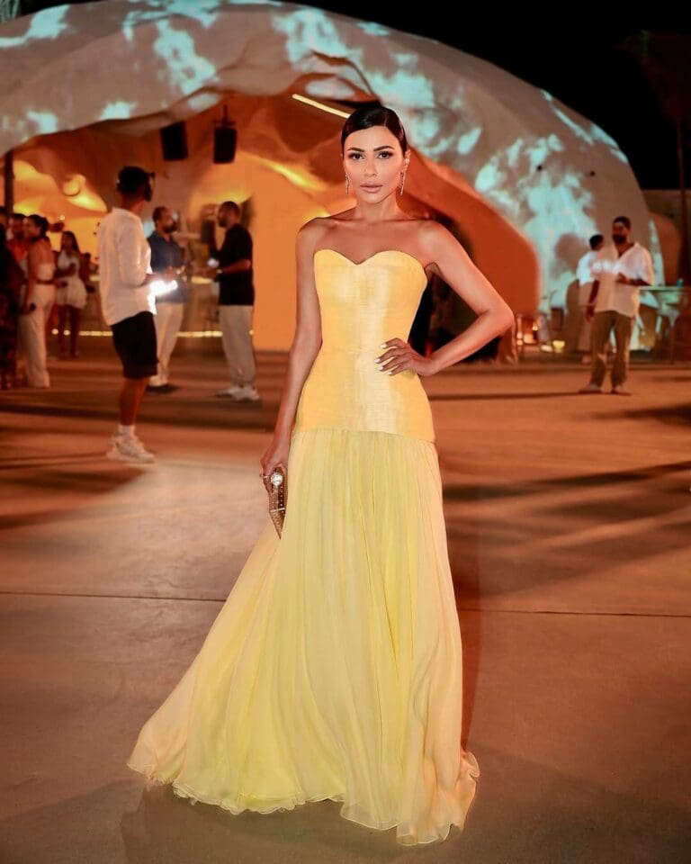 - درة زروق أطلّت بفستان سترابلس أنيق بلون أصفر لامع، أبرز قوامها وأضفى لمسة من الجرأة والرقي، خاصة مع الفتحة الجانبية العالية والقماش الشفاف السفلي.