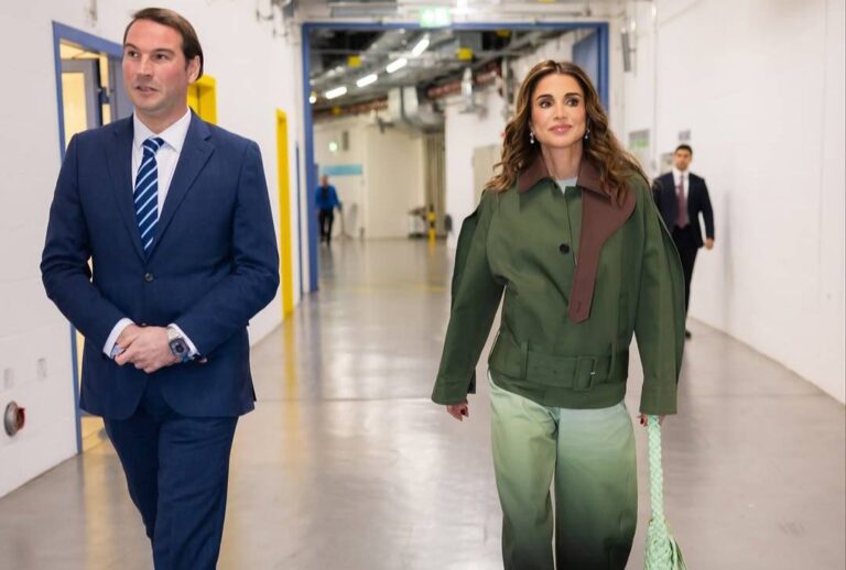 وأكملت الملكة رانيا إطلالتها بحذاء أبيض أنيق وحقيبة صغيرة باللون الأخضر الفاتح، مع مجوهرات بسيطة وناعمة عززت من طابع الإطلالة العملي الراقي الذي عُرفت به.