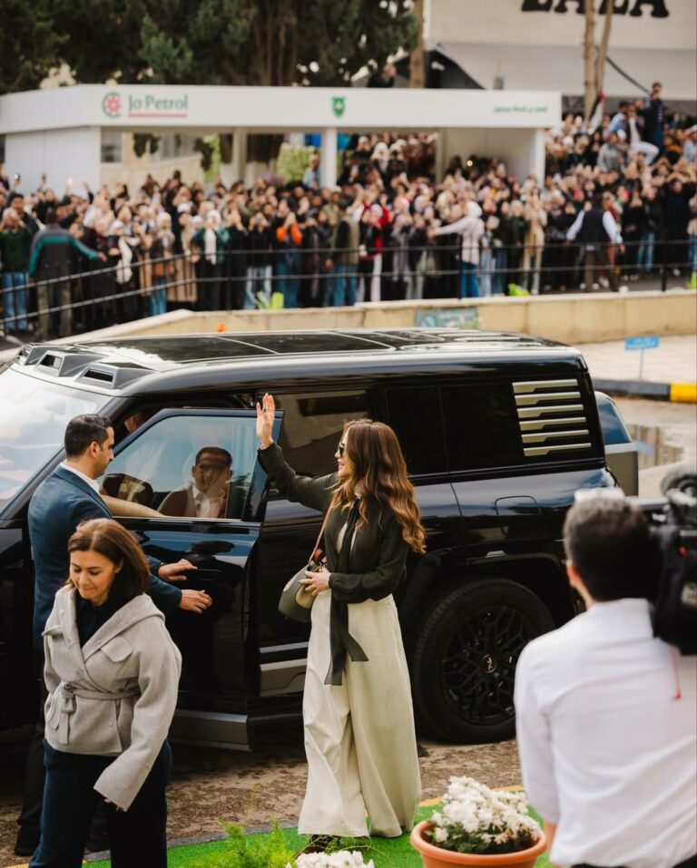 اختارت الملكة رانيا بلوزة زيتونية من Maison Alaïa مع وشاح خفيف أضفى حركة وأناقة، ونسّقتها مع بنطال واسع الأرجل بلون كريمي من Palmer Harding. ولإكمال الإطلالة، اختارت حقيبة من Loewe تجمع بين درجات الكريمي والأخضر، لتصبح قطعة مركزية تربط بين جميع عناصر المظهر، بينما جاء الحذاء من Jennifer Chamandi.