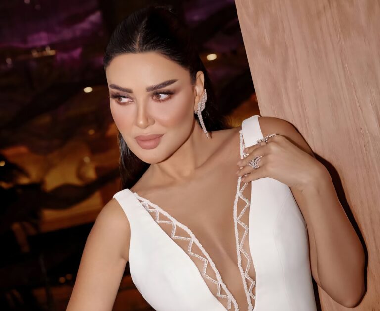 ارتدت سيرين فستاناً طويلًا بقصة مستقيمة ينسدل إلى الأرض، مع فتحة ساق جانبية عالية، وفُتحة V عميقة مزينة بالشيفون المطرز، ما جمع بين البساطة واللمسات الأنثوية الجريئة. أكملت طلّتها بمجموعة مجوهرات فاخرة من الذهب الأبيض، تضمنت أقراطاً ضخمة وسلسلة مميزة وخاتماً مرصّعاً بالكامل، مع صندل كلاسيكي فضي.