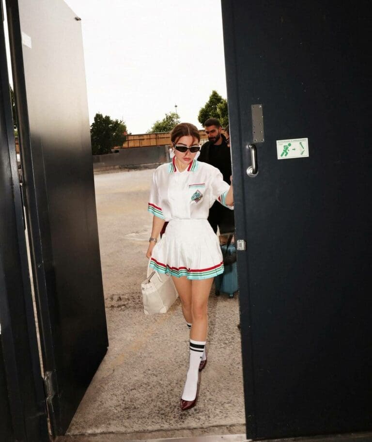 ارتدت هيفا توبًا رياضيًا مستوحى من أجواء المباريات، بتصميم مقلم بالأزرق والأحمر، نسقته مع تنورة قصيرة باللون الأبيض، مما أعطى للإطلالة طابعًا حيويًا وشبابيًا. أما اللافت، فكان الجوارب البيضاء العالية التي منحت اللوك بعدًا مدرسياً أو شبه أولمبي، ليكتمل الطابع الرياضي بتفاصيل دقيقة.