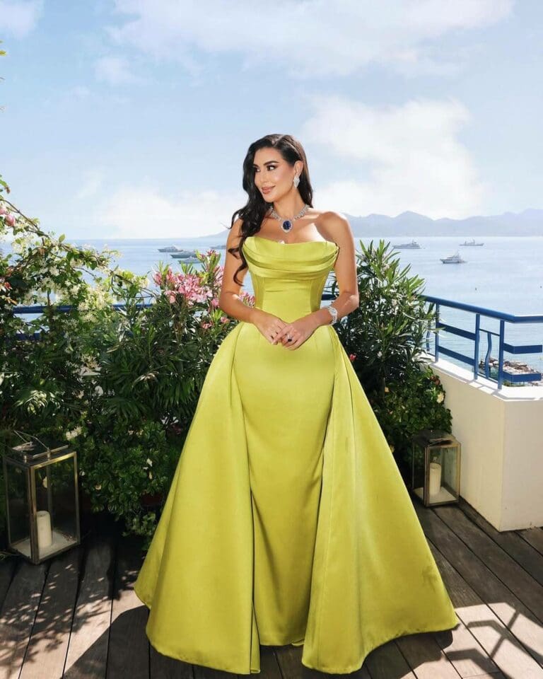الفستان، الذي اختارته ياسمين، جاء باللون الأخضر الليموني الجريء، مما أضفى على إطلالتها لمسة من الانتعاش والجرأة في آن واحد. التصميم كان مكشوف الأكتاف مع قصة ضيقة عند الصدر والخصر، مما أبرز رشاقتها وأضاف إليها لمسة من الأنوثة الراقية. الفستان كان طويلاً منسدلاً مع ذيل خلفي أنيق، مما أضاف بُعدًا دراميًا ناعمًا يتناغم مع بساطة التصميم وفخامته في الوقت نفسه. إضافة إلى ذلك، تميز الفستان بتفصيل جانبي على مستوى الفخذ من نفس قماش الفستان، مما أضاف له حركة طبيعية دون الحاجة إلى تفاصيل معقدة.