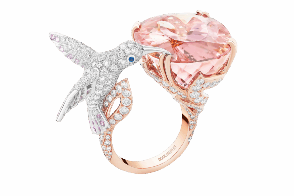 خاتم مستوحى من طائر الطنّان، يزدان بحجر مورغانيت ضخم محاط بالماس والياقوت الزهري والأزرق، في مشهد طبيعي مبهج مصاغ من الذهب الأبيض والوردي.