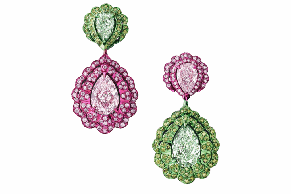 أقراط تنبض بالألوان، تجمع بين الياقوت الوردي والأخضر مع لمسات من الماس المتلألئ، في مزيج يعكس البهجة والرقي.