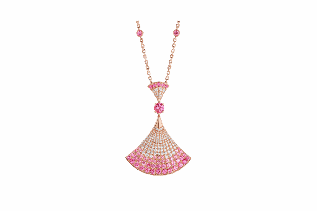 عقد من الذهب الوردي تتوسطه قطعة ياقوت زهري محاطة بأحجار ياقوت وألماس، يجمع بين الفخامة الكلاسيكية واللمسة العصرية، بتصميم يحتفي بالأنوثة في أجمل صورها.