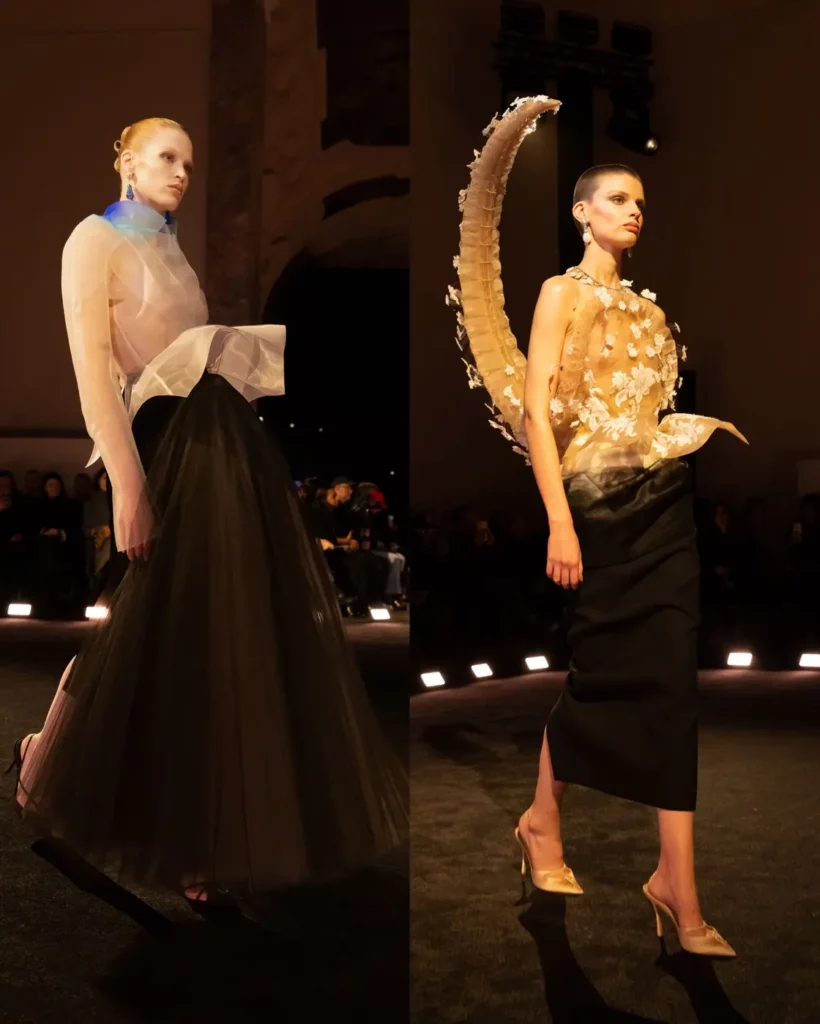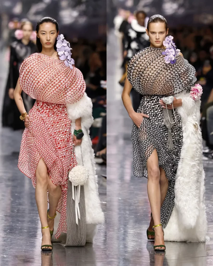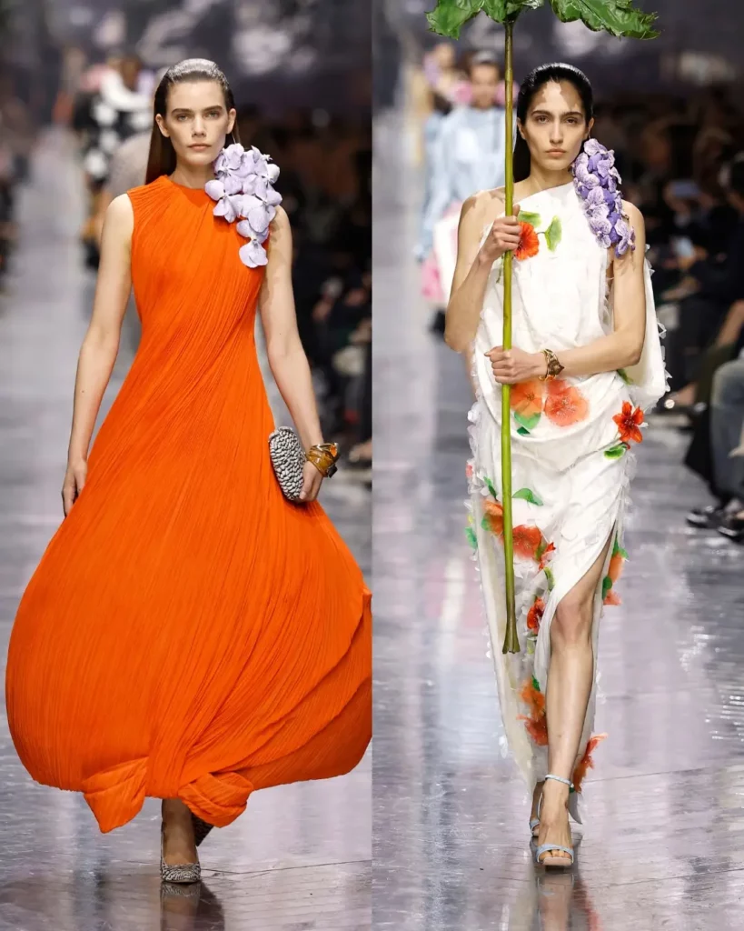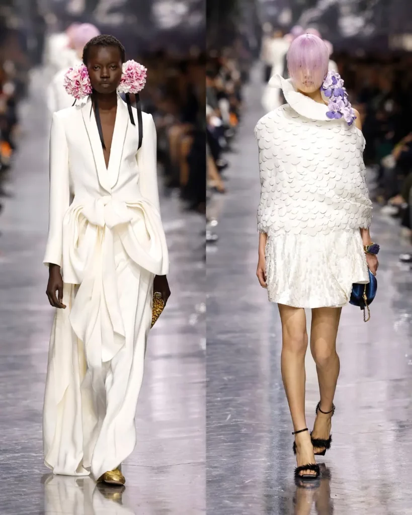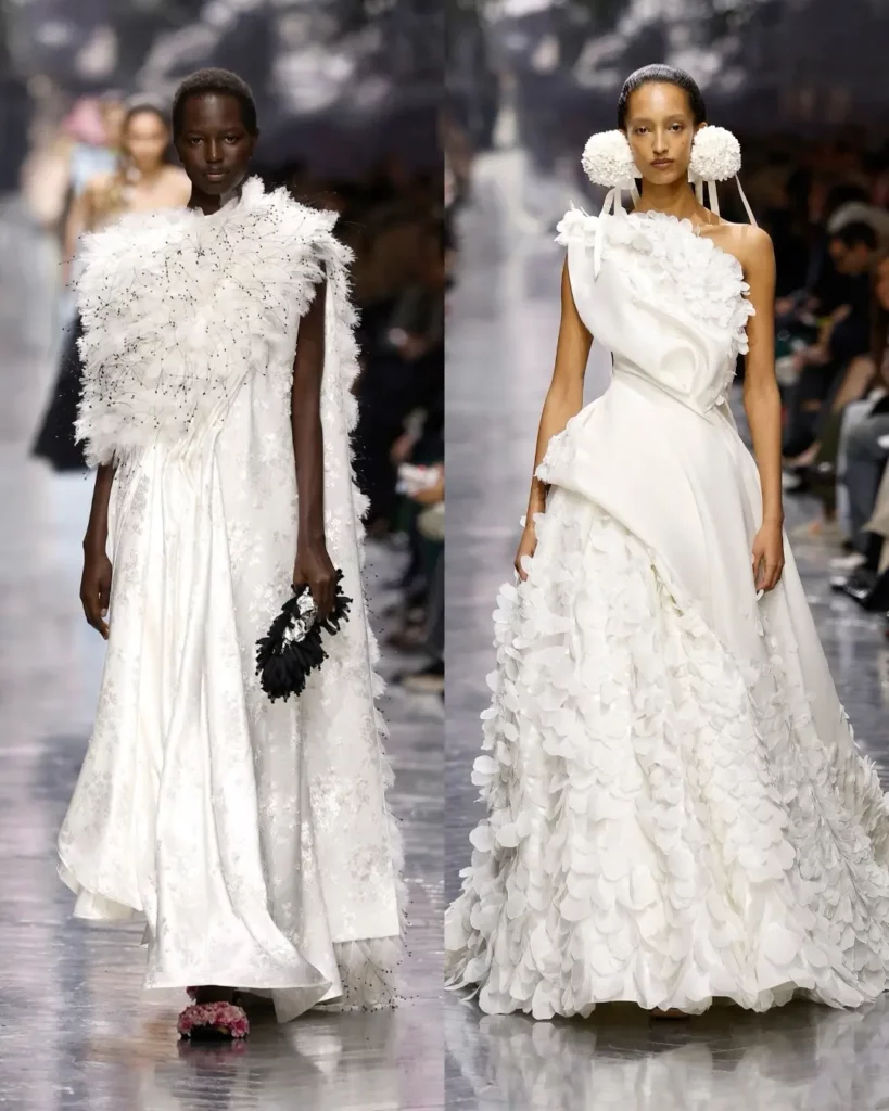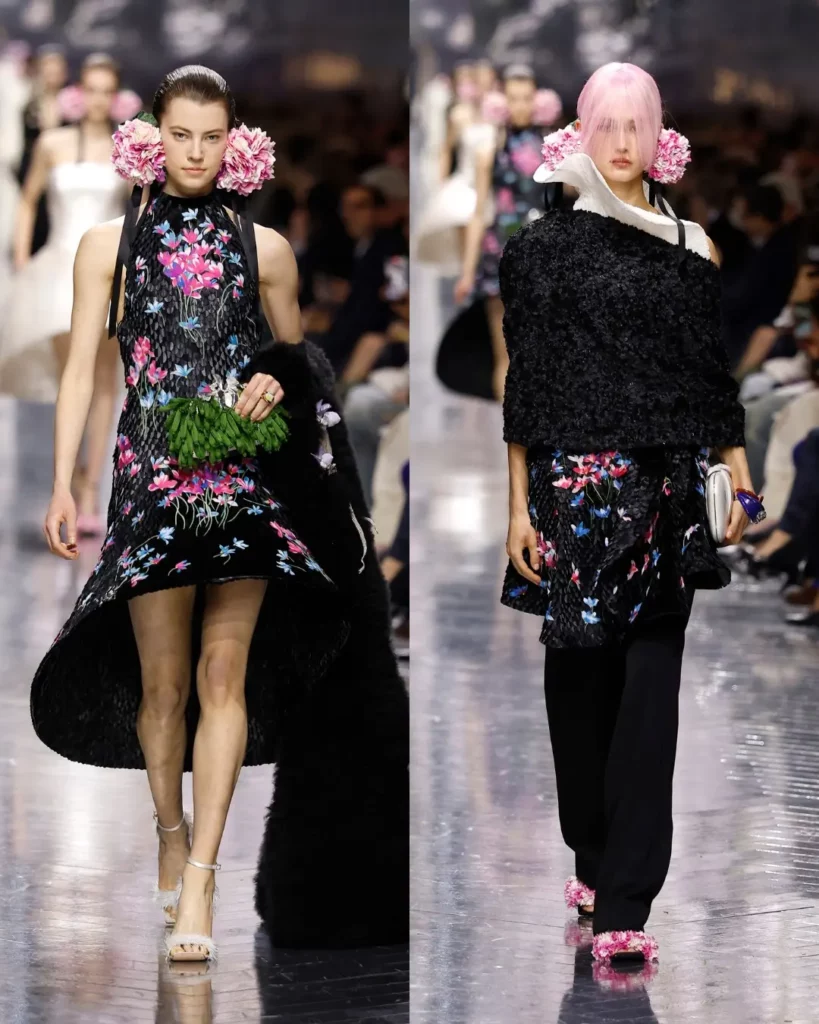 أما دار ديور، فقدم المدير الإبداعي الحالي جوناثن أندرسون أول عرض له للأزياء الراقية، والذي شكل مفاجأة الموسم بفضل لمسته الإبداعية الفريدة. استلهم العرض من باقة أزهار “بخور مريم” التي حصل عليها من جون غاليانو المدير الإبداعي السابق للدار، لتزين الأثواب والحقائب والأحذية وحتى سقف خيمة العرض في متحف رودان، الذي غُطّي بالطحالب والأزهار المتساقطة.
