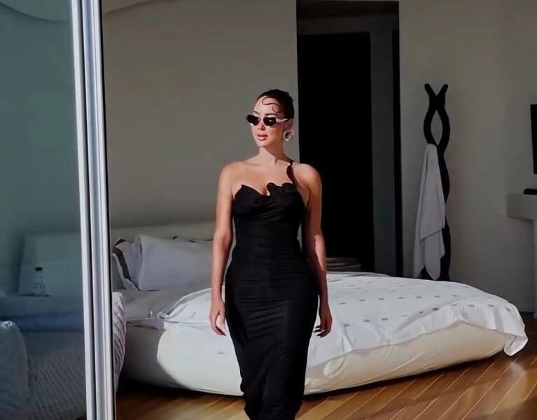 ظهرت بسمة بفستان أسود طويل وضيّق، أبرز رشاقتها وجمال قوامها. وتميز التصميم بياقة متعرّجة جاءت بأسلوب الكتف الواحدة المكشوفة، ما أضفى لمسة من الجرأة والأنوثة في آنٍ واحد.