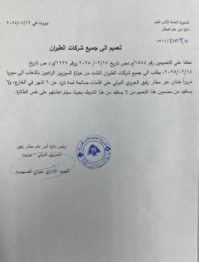أصدر مطار رفيق الحريري الدولي تعميماً يمنع دخول أي مواطن سوري إلى لبنان عبر المطار، في حال كان متوجهاً إلى سوريا، ما لم يكن بحوزته إقامة صالحة في الخارج تتجاوز مدّتها ستة أشهر.