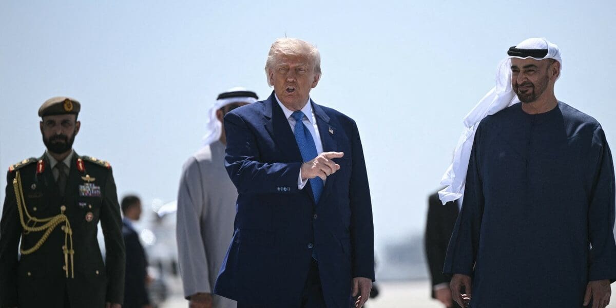 US President Donald Trump (L), accompanied by his UAE counterpart Sheikh Mohamed bin Zayed Al Nahyan, prepares to board Airforce One in Abu Dhabi at the end of his Middle East tour on May 16, 2025. Trump capped his Gulf tour in Abu Dhabi after signing another raft of multi-billion-dollar deals, while also securing a $1.4 trillion investment pledge from the UAE. (Photo by Brendan SMIALOWSKI / AFP)