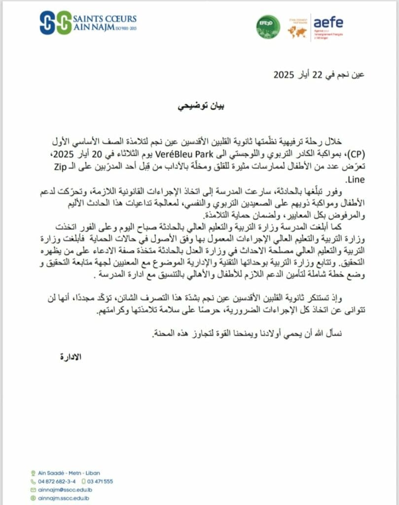 عقب انتشار خبر صادم يتعلق بتعرض عدد من الأطفال لحالات تحرش خلال رحلة مدرسية نظمتها مدرسة القلبين الأقدسين – عين نجم، أصدرت الإدارة بياناً توضيحياً أكدت فيه اتخاذها الإجراءات اللازمة لمعالجة الحادثة.
