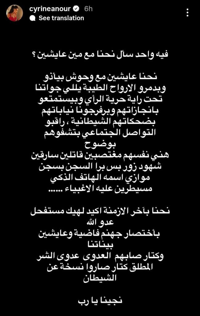 وفي نهاية منشورها، اختتمت سيرين حديثها بتأكيد الشعور باليأس من انتشار الشر والكراهية بين الناس، قائلة: “نحنا بآخر الأزمنة أكيد لهيك مستفحل عدو الله، باختصار جهنم فاضية وعايشين بيناتنا وكتار صابتهم العدوى، عدوى الشر المطلق… كتار صاروا نسخة عن الشيطان، نجّينا يا رب”.