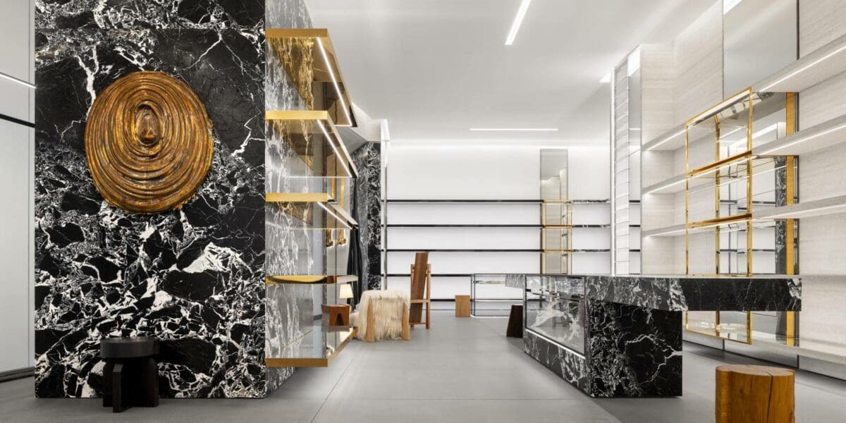 تلعب منطقة الجلوس المصممة خصيصًا باستخدام قطع أثاث عتيقة دورًا مهمًا في تصميم المتجر العام، ويمكن للزبائن أيضًا تخصيص صالون حصري مزود بغرفة قياس خاصة.