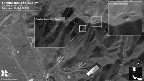 أظهرت صور حديثة التقطتها الأقمار الاصطناعية أضراراً واضحة لحقت بالجبال التي تحتضن موقع فوردو النووي الإيراني تحت الأرض، عقب الضربات الجوية الأميركية التي استهدفته قبل ساعات، وفقاً لتحليل نشرته وكالة «أسوشييتد برس».
