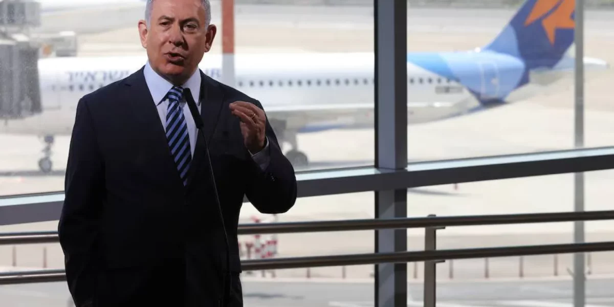 رئيس الوزراء الإسرائيلي بنيامين نتنياهو متحدثاً من مطار بن غوريون الدولي في اللد بالقرب من تل أبيب