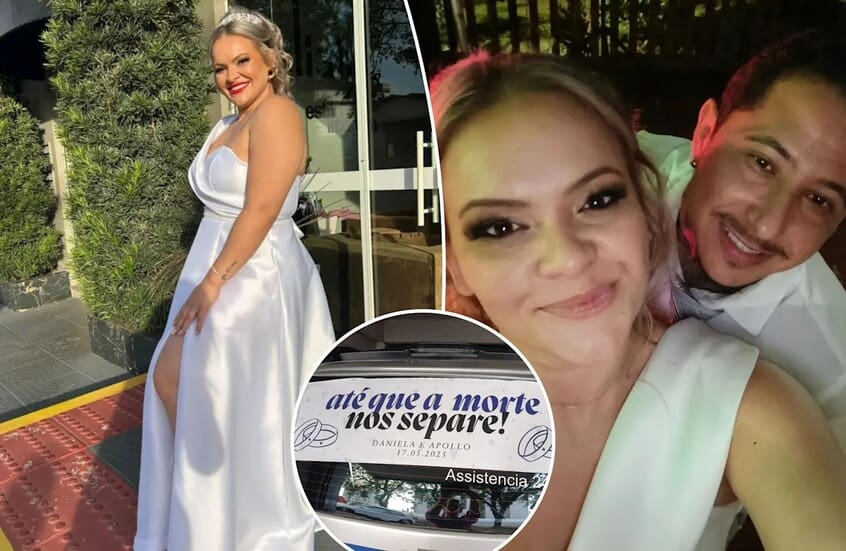العروس دانييلا سينيور، البالغة من العمر 33 عاماً، اختارت هذه الطريقة غير الاعتيادية للوصول إلى حفل زفافها من شريكها أبولو سكاريوت، البالغ من العمر 31 عاماً، بالقرب من ساو باولو في البرازيل.