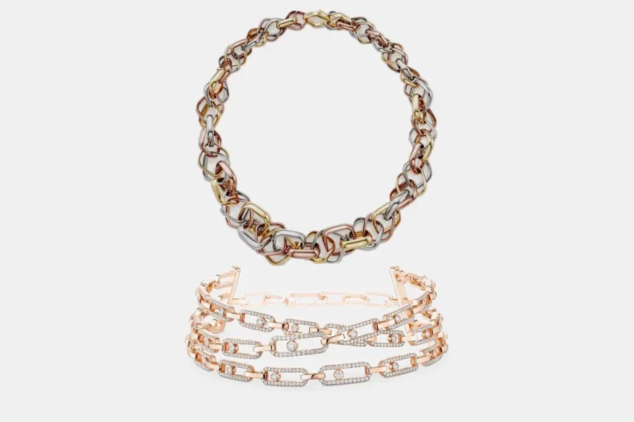 ومن دار ميسيكا (Messika)، يقدّم عقد Move Link بتصميم ثلاثي الصفوف رؤية معاصرة تمزج الهندسة بالحركة، عبر جنزير من الذهب الوردي المرصّع بالألماس، مع تلاعب مقصود بالضوء والأشكال ليخلق تأثيراً ديناميكياً يلفت الانتباه ويعيد ابتكار رمز «Move» بأسلوب قوي.