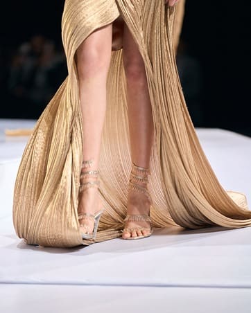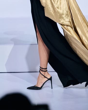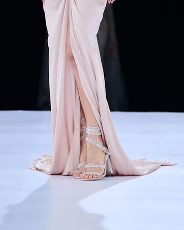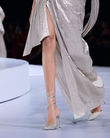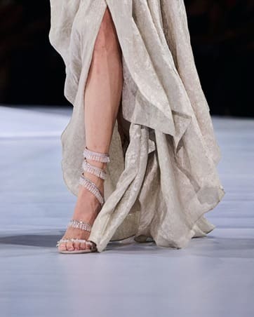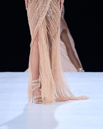 يُقدَّم بثلاثة إصدارات مصنوعة من الساتان والديباج الهندي بدرجات عاجية وبيج فاتحة، مع كعب 105 ملم وسلسلة كريستالات تتدلى بانسيابية مذهلة.