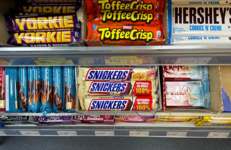 شهدت متاجر في لندن عرض شوكولاتة ٨٢٢٠;سنيكرز٨٢٢١; بعبوات مكتوبة بالكامل باللغة الروسية، بما في ذلك نوعي ٨٢٢٠;سنيكرز٨٢٢١; بالشوكولاتة البيضاء ونكهة الآيس كريم ٨٢٢٠;البلامبير٨٢٢١;، وفق تقرير صحيفة ٨٢٢٠;نيويورك تايمز٨٢٢١;.