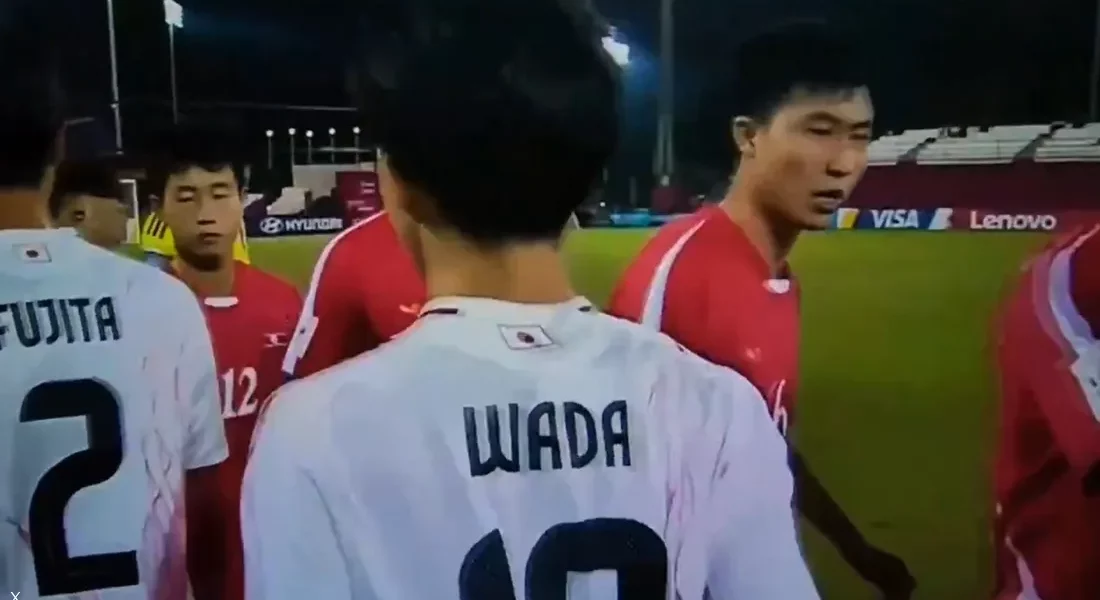 فخلال تبادل التحية بين لاعبي الفريقين قبل انطلاق المباراة، أقدم عدد من لاعبي كوريا الشمالية على ضرب قبضة اللاعبين اليابانيين بقوة خلال المصافحة، في تصرّف اعتبره كثيرون استفزازياً وغير رياضي. وانتشرت مقاطع الفيديو بكثافة عبر منصات التواصل، مظهرة الملامح المتشنّجة للاعبي كوريا الشمالية قبل صافرة البداية.