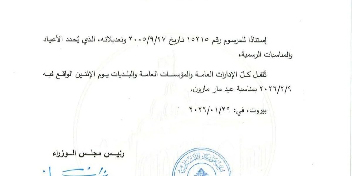 صدر تعميم يقضي بإقفال الإدارات العامة والمؤسسات العامة والبلديات يوم الإثنين الواقع في 9 شباط 2026، لمناسبة عيد مار مارون، على أن يُستأنف العمل كالمعتاد في اليوم التالي.