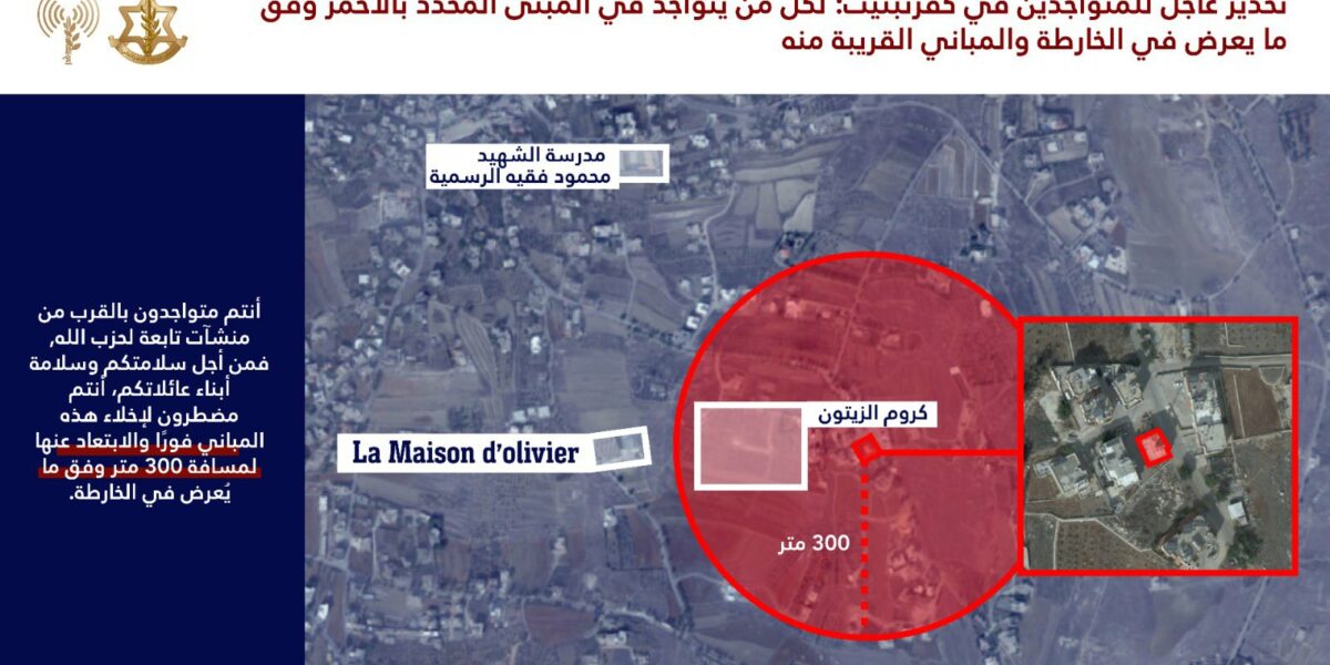 وتابع أدرعي: “نحث سكان المبنييْن المحدديْن بالأحمر في الخريطتيْن المرفقتيْن والمباني المجاورة لهما: أنتم تتواجدون بالقرب من مباني يستخدمها حزب الله فمن أجل سلامتكم أنتم مضطرون لإخلائها فورًا والابتعاد عنها لمسافة لا تقل عن 300 متر.”