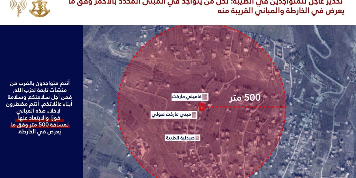 وحثّ أدرعي سكان المباني المعلّمة بالأحمر في الخرائط المرفقة، والمباني المجاورة لها في قريتي الطيبة وطير دبّا، على إخلائها فورًا والابتعاد مسافة لا تقل عن 500 متر «حفاظًا على سلامتهم»، مؤكدًا أن البقاء ضمن نطاق تلك المباني «يعرضهم للخطر». ولم تصدر على الفور تعليقات من الجانب اللبناني أو من «حزب الله» بشأن التحذير.