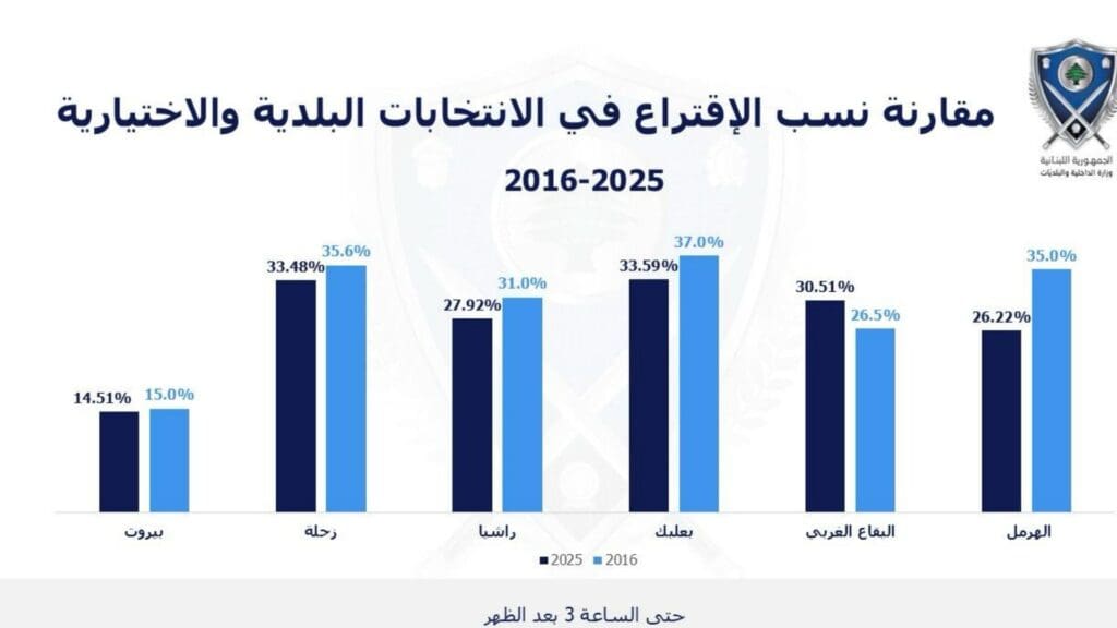 تتابعون في الصورة المرفقة، مقارنة نسب الاقتراع في محافظات بيروت وبعلبك – الهرمل والبقاع بين عامي 2016 و2025، حتى الساعة 3 بعد الظهر.
