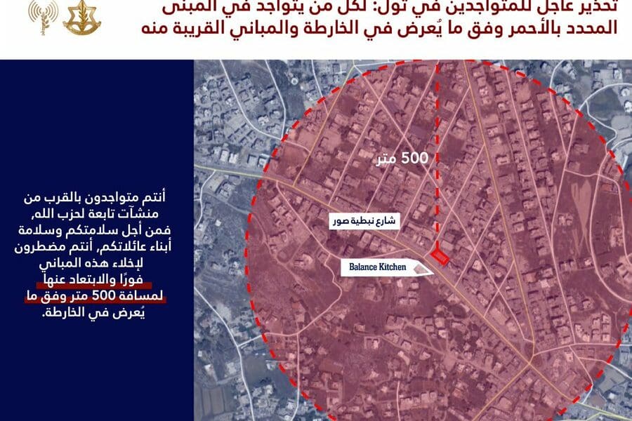 “تحذير عاجل للمتواجدين في قرية تول في جنوب لبنان وتحديدًا لكل من يتواجد في المبنى المحدد بالأحمر وفق ما يُعرض في الخارطة والمباني القريبة منه.”
