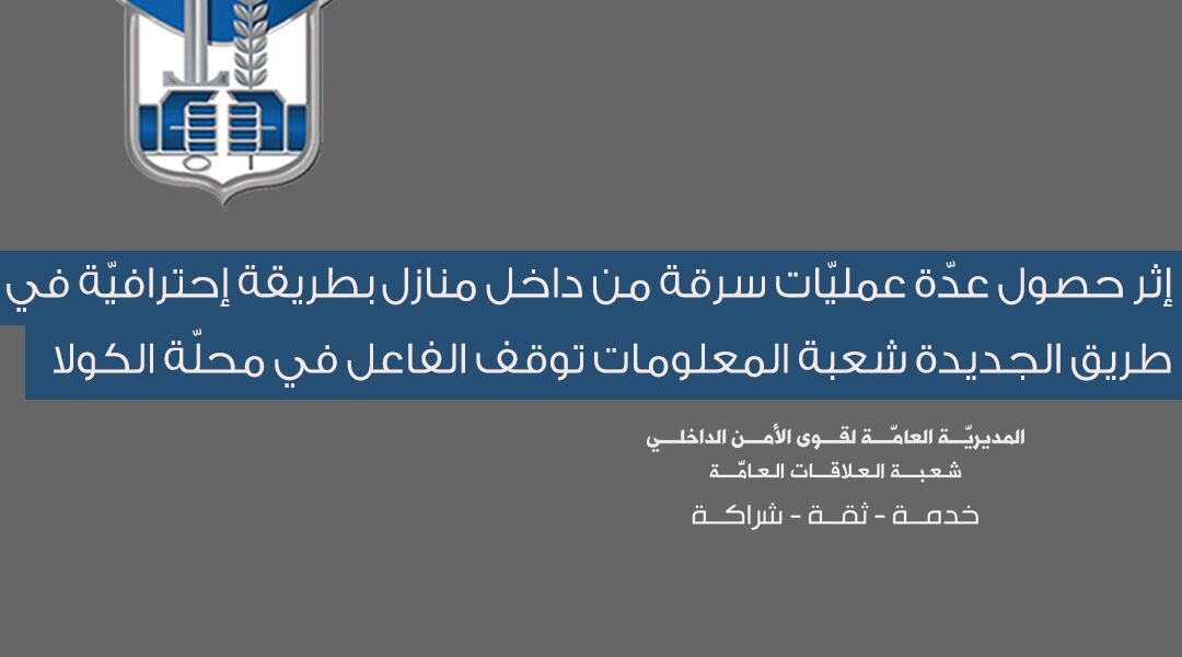 على إثر حصول عدّة عمليّات سرقة من داخل منازل في محلّة طريق الجديدة، نُفّذت بطريقة احترافيّة عبر كسر وفتح الأبواب باستخدام أدوات حديديّة، وكان آخرها سرقة مصاغٍ ذهبي تُقدَّر قيمته بحوالَي ستّين ألف دولار أميركي، كثّفت القطعات المختصّة في قوى الأمن الدّاخلي جهودها لكشف هويّة الفاعل، وتوقيفه. بنتيجة المتابعة والاستقصاءات المكثّفة، تمكّنت شعبة المعلومات من تحديد كامل هويّة المشتبه به. وبناءً عليه، نُفِّذ كمين محكم في محلّة الكولا، حيث تمكّنت دوريّة من شعبة المعلومات، بتاريخ 12-1-2026، من توقيف المدعو: ف. م. (مواليد عام 1991، سوري) باستماعه، اعترف بإقدامه على /4/ عمليّات سرقة من داخل منازل في محلّة طريق الجديدة، ولا سيّما في محيط جامعة بيروت العربيّة والملعب البلدي، كان آخرها بتاريخ 11-1-2026، وقد قُدّرت قيمة المسروقات، وهي عبارة عن مصاغٍ ذهبي، بحوالَي /60,000/ دولار أميركي. كما تبيّن أنّه من أصحاب السّوابق في جرائم السّرقة، ويعتمد أسلوب الدّخول إلى المنازل وسرقة المجوهرات منها. أُجري المقتضى القانوني بحقّه، ولا يزال التّحقيق جاريًا، بإشراف القضاء المختص.