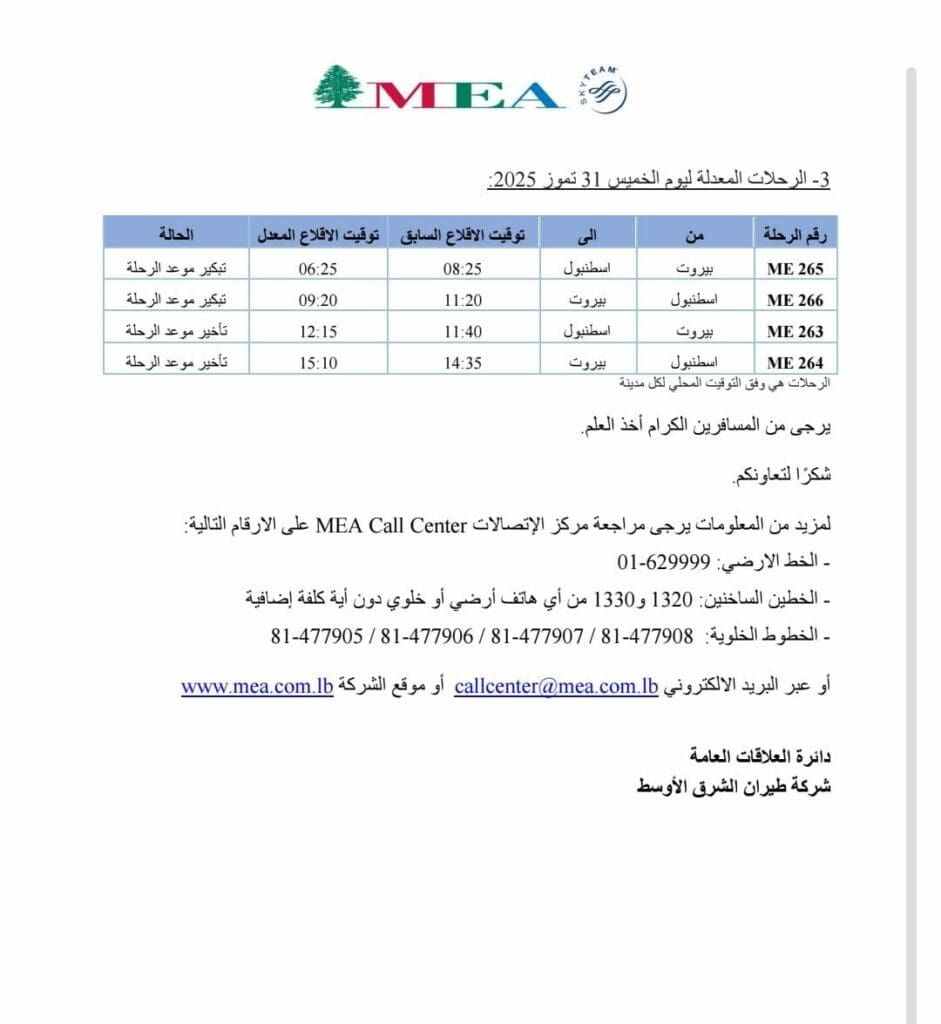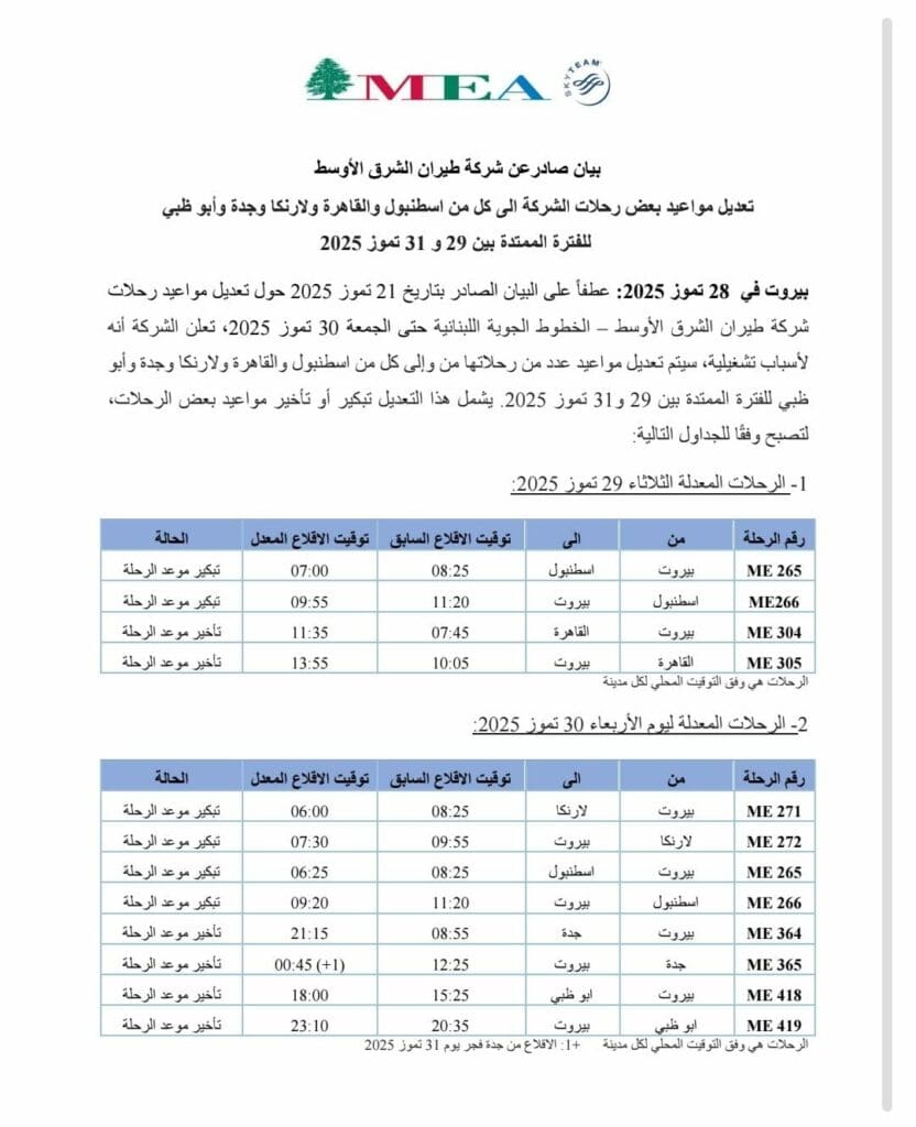 أعلنت شركة طيران الشرق الأوسط أنه لأسباب تشغيلية، سيتم تعديل مواعيد عدد من رحلاتها من وإلى كل من اسطنبول والقاهرة ولارنكا وجدة وأبو ظبي للفترة الممتدة بين 29 و31 تموز2025 . يشمل هذا التعديل تبكير أو تأخير مواعيد بعض الرحلات، لتصبح وفق الجداول المرفقة بالخبر.