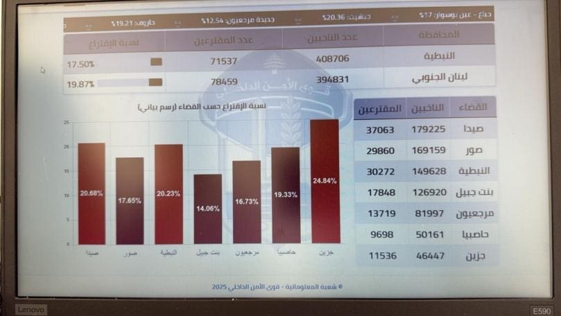 أعلنت وزارة الداخليّة والبلديّات أنّ نسبة الإقتراع في أقضية محافظتي الجنوب والنبطيّة توزّعت على الشكل الآتي:
