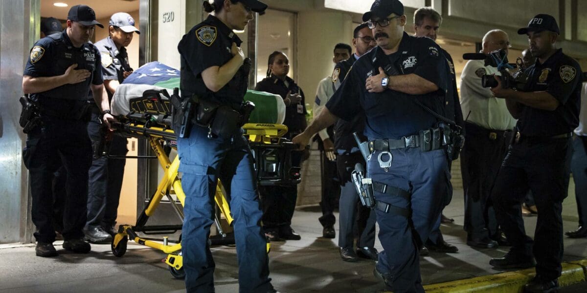 عائلة وأصدقاء الضابط المقتول ديدارول إسلام الذي قُتل برصاص مسلح في وقت سابق من هذا المساء يغادرون مستشفى نيويورك – بريسبتيريان (أ.ب)