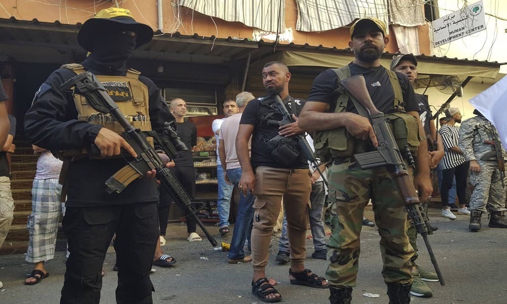 Palestinian Fatah fighters from Al-Aqsa Martyrs' Brigades, stand guard during the funeral procession of Khalil al-Maqdah, the brother of Fatah Gen. Mounir al-Maqdah, who was killed by an Israeli strike on a vehicle in the southern port city of Sidon, at the Palestinian refugee camp of Ein el-Hilweh, south Lebanon, Wednesday, Aug. 21, 2024. (AP Photo/Mohammed Zaatari)