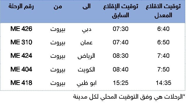 وجاء في البيان: “نظراً للظروف الراهنة وما تفرضه من تغييرات في بعض المسارات الجوية التي ينتج عنها زيادة مدة الرحلات، تعلن شركة طيران الشرق الأوسط – الخطوط الجوية اللبنانية عن تقديم مواعيد إقلاع عدد من رحلاتها المتوجهة من بيروت الى الاردن والخليج العربي خلال الفترة الممتدة من 18 حزيران ولغاية 20 حزيران 2025، وذلك وفقاً للجدول المرفق بالخبر.