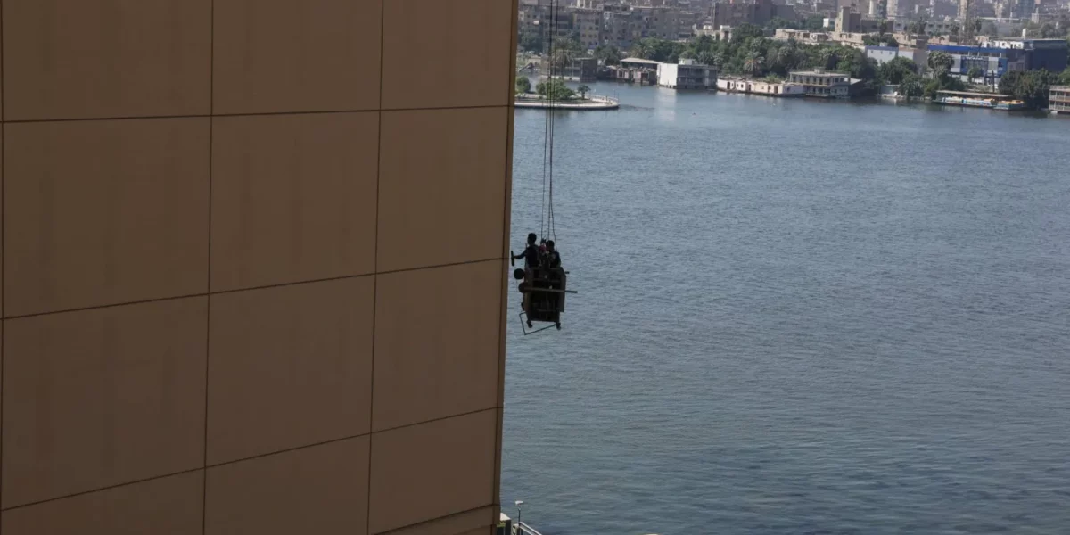 عمال مصريون ينظفون مبنى برج نايل سيتي بالقرب من نهر النيل