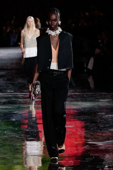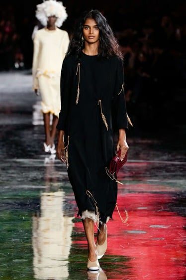 لاحقًا، استحضر بلازي ملامح من العشرينيات عبر فساتين شيفون مطرز وساتان، كما عاد إلى الستينيات بتنورات ميدي بحافة مزخرفة وأزرار جانبية. ولم تغب سنابل القمح الذهبية، تميمة الحظ الخاصة بكوكو، عن المشهد، إذ زُيّن بها فستان أسود أنيق.